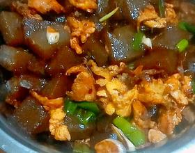 鸡蛋炒成块后接着倒入凉粉 葱花蒜末 然后加适量盐和老抽翻炒3分钟左右即可 最后放入适量鸡精