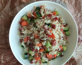 腊肠熟后下黄瓜丁,米饭,放少许盐翻炒均匀