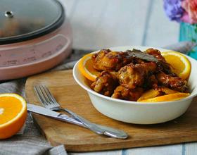 - 5. 倒入鸡腿儿,加入调好的酱汁,盖上锅盖,将鸡腿肉焖制30分钟,直至熟软,撒入盐和胡椒粉进行调味,起锅前放入香橙片进行装饰