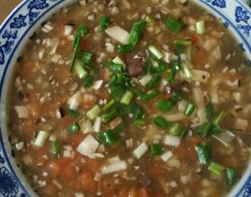 香菇,番茄,春笋,鸭肠切丁;豆腐,猪血切条