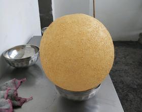 从慢档开始搅拌,全部面粉材料在一起均匀后,在开快档,总共搅拌10分钟。接下来,在桌面撒些干糯米粉防止沾桌子,把已经搅拌10分钟的面刮出来,搓成长条,切300g一个。这么大一个足够炸成图片一样大的了,可以增加或者减少面团的重量。面团重量增加炸出来的麻球也会很大。需要做好准备足够大工具。