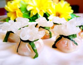 水烧开立即烫虾饺粉,这样皮子才会透亮,馅料随意放,篦子上可用油纸或胡萝卜垫底防粘。韭菜叶也可用蒜苗叶代替。