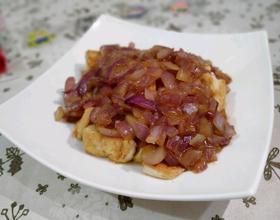 最后一步把勾芡好的洋葱浇入放好豆腐的盘中就完成了