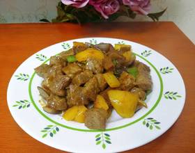 - 5. 再放入腌制好的牛肉块,中火炒到牛肉表面变色,倒入牛排附赠的黑胡椒汁,再炒两分钟即可盛出。