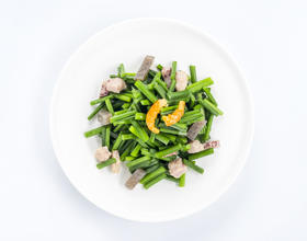 放入猪肉、虾米、魔芋、盐、调味粉,快速翻炒1分钟