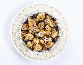 盛出花螺,用锡箔纸包裹紧实。把包好的花螺放入砂锅中的粗盐上,盖上锅盖。中火焖3分钟,即可享用
