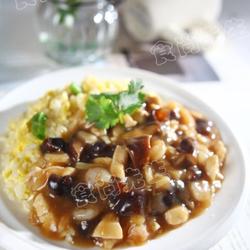 用料:去骨鸡胸肉、干香菇、虾仁、干贝(泡发)、海参、鸡蛋、白饭、葱、盐、白胡椒粉、高汤、蚝油、糖、太白粉水、芝麻香油
